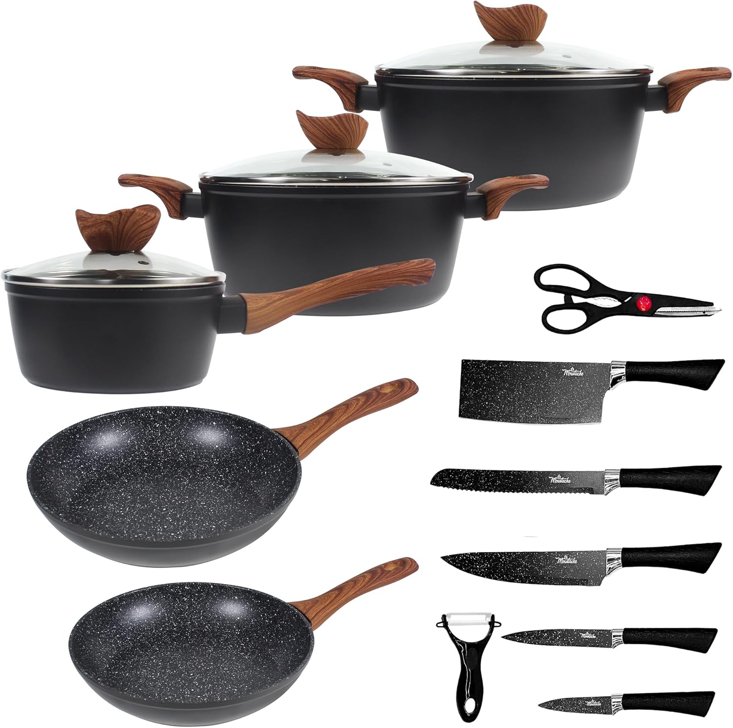 - 6 – La Moustache – Conjunto de Utensílios de Cozinha de Alumínio com Antiaderente | 8 Peças Callao + 5 Facas Inox com Pelador de Vegetais e Tesouras, Panelas/Frigideiras para Todos os Tipos de Fogões