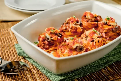 - Montagem no Prato: Em uma travessa ou assadeira, disponha os ninhos de macarrão e cubra cada ninho com uma porção generosa do molho de carne moída. Certifique-se de distribuir o molho uniformemente para que todos os ninhos estejam bem cobertos.